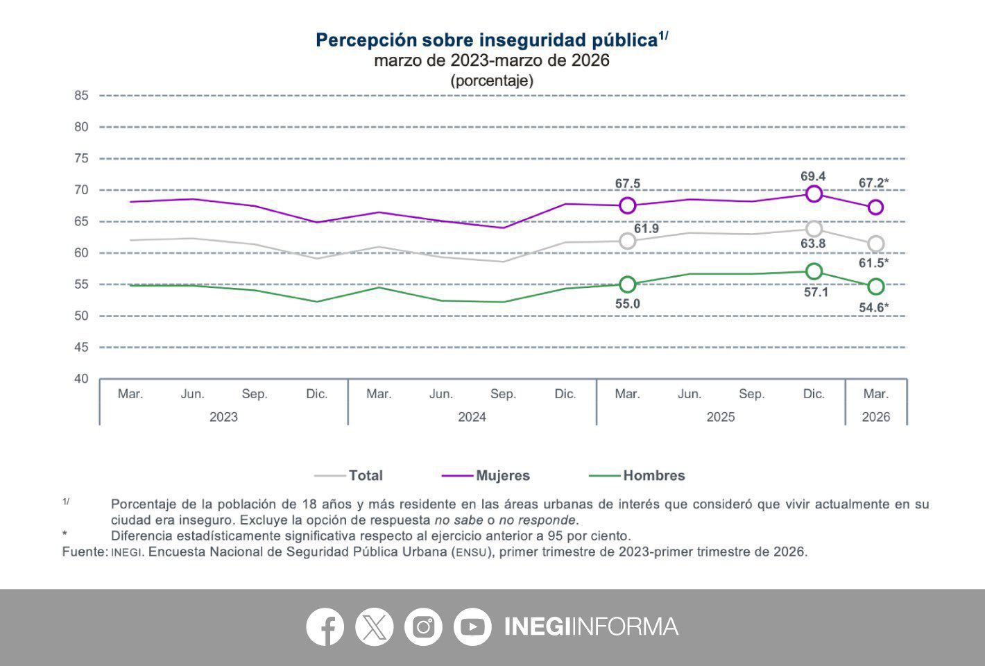De acuerdo con la Encuesta Nacional de Seguridad Pública Urbana (ENSU), elaborada por el Instituto Nacional de Estadística y Geografía (INEGI), en marzo de 2026 el 61.5% de la población de 18 años y más consideró inseguro vivir en su ciudad.